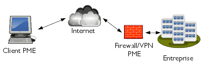 Cette solution est proposé aux clients désirant posséder un serveur VPN sur leur réseau et ainsi bénéficier des fonctionnalités offert par ce biais, il pourront avec un simple client VPN se connecter sur leur serveur et avoir accès à leur réseau du bureau, aux partages de fichiers, aux imprimantes, comme si ils se trouvaient au bureau.